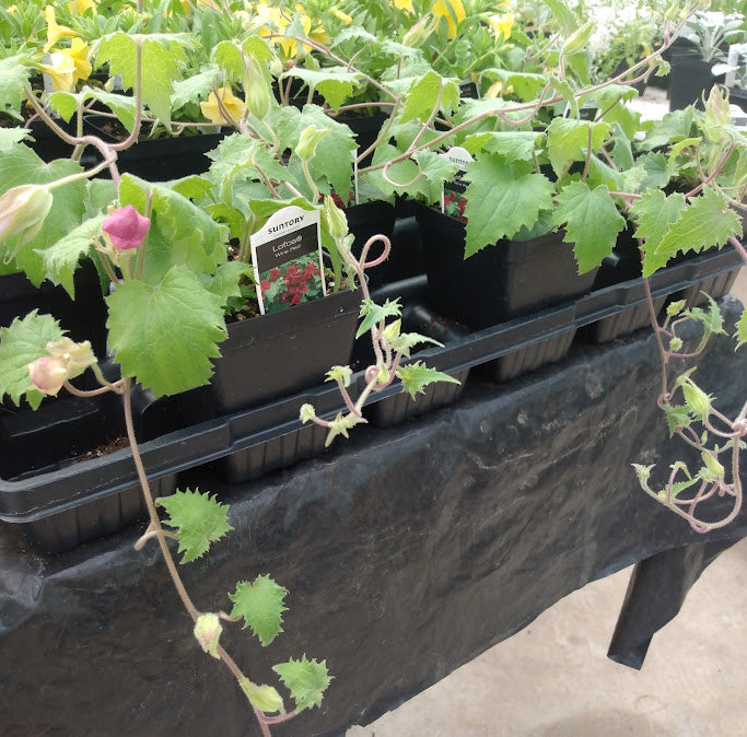 Lofos is an elusive beautiful trailer gaining increased attention lately. It can be seen in high end baskets hanging delicately down graced with large tubular flowers on silvery green foliage.